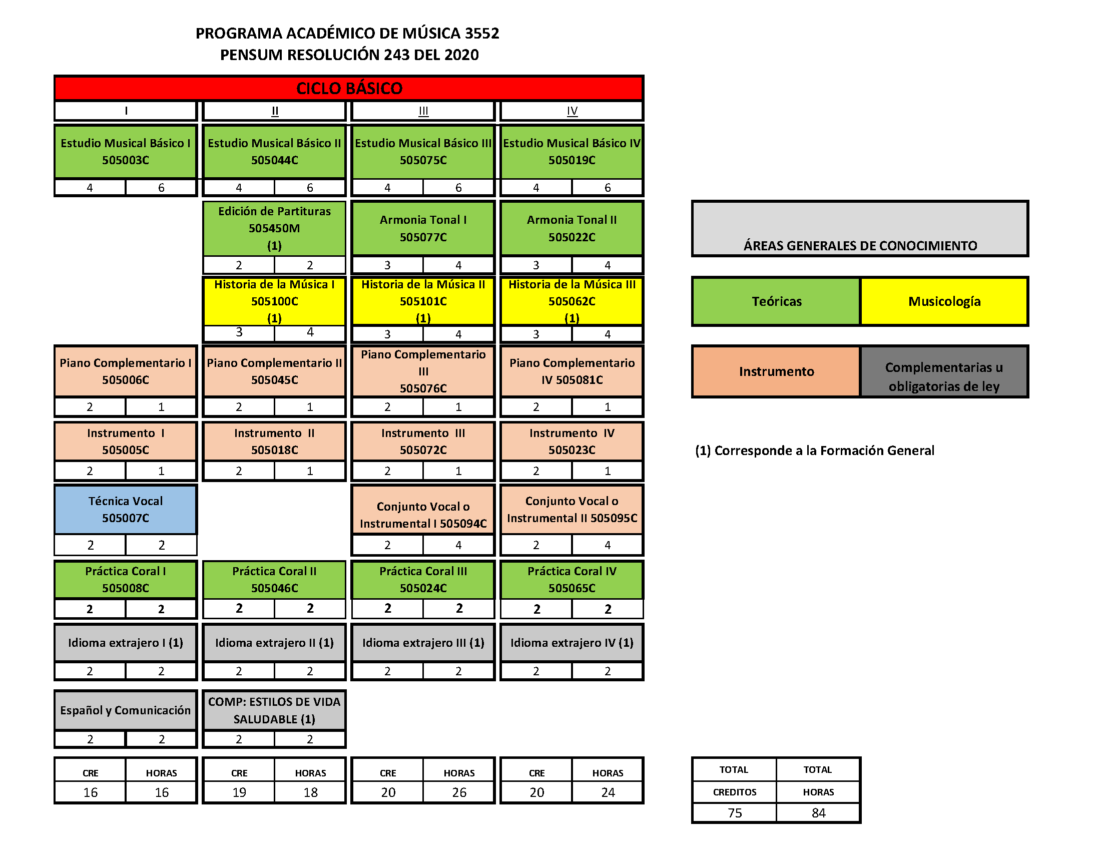 El Programa Académico de Pregrado en Música forma Profesionales de alto desempeño en cuatro áreas de profundización: Interpretación instrumental, Dirección de conjuntos vocales e instrumentales, Composición y Musicología. El Programa Académico está articulado en dos Ciclos de formación, el Ciclo de Fundamentación y el Ciclo Profesional. Su ingreso es anual y el número de admitidos en cada cohorte es de 20 estudiantes.